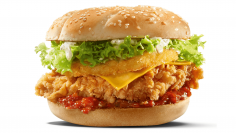Bun, chicken cutlet, pickled onion, tomato, pesto sauce, mozzarella cheese, lettuce, Chips.