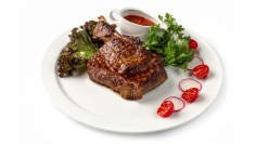 Pork ribs, cherry tomatoes, arugula, microgreens, salad dressing, rib sauce. 510 grams.