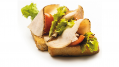 Ciabatta, pesto sauce, beef, sun-dried tomato, Parmesan cheese, microgreens.